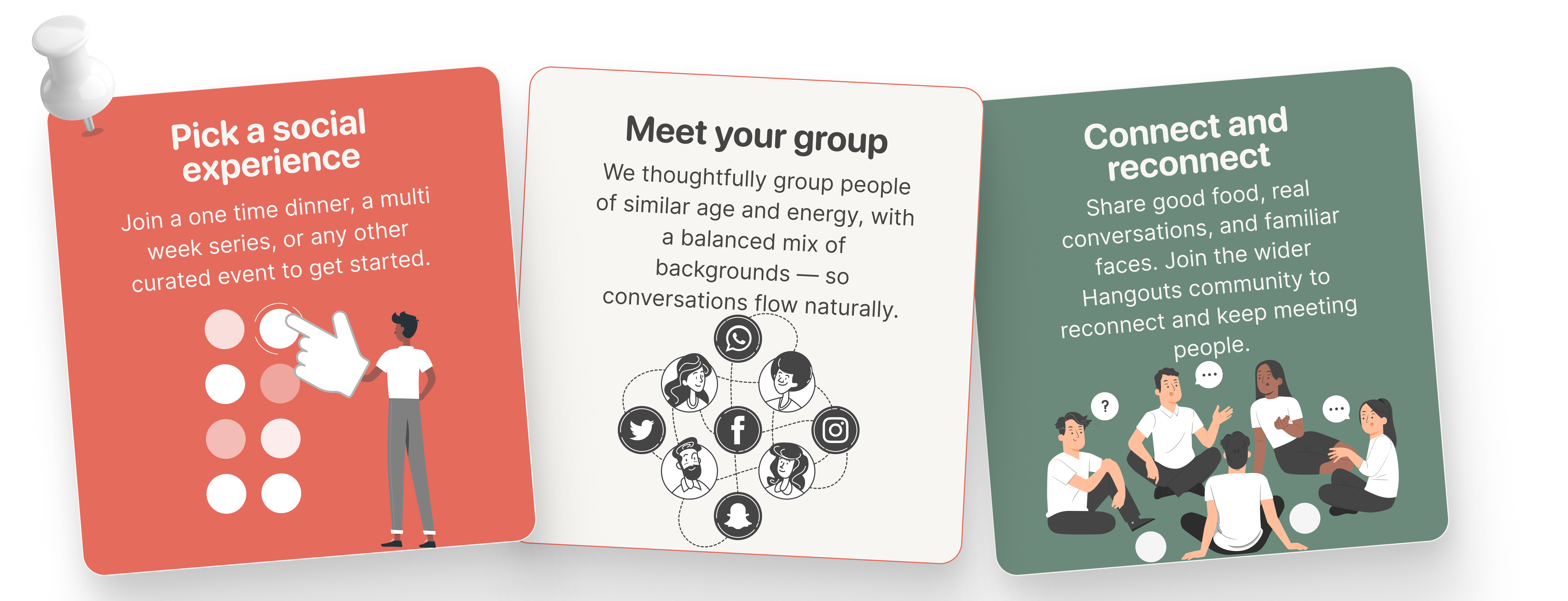 Meet 6 new people over dinner. Exact locations are shared 24 hours before.